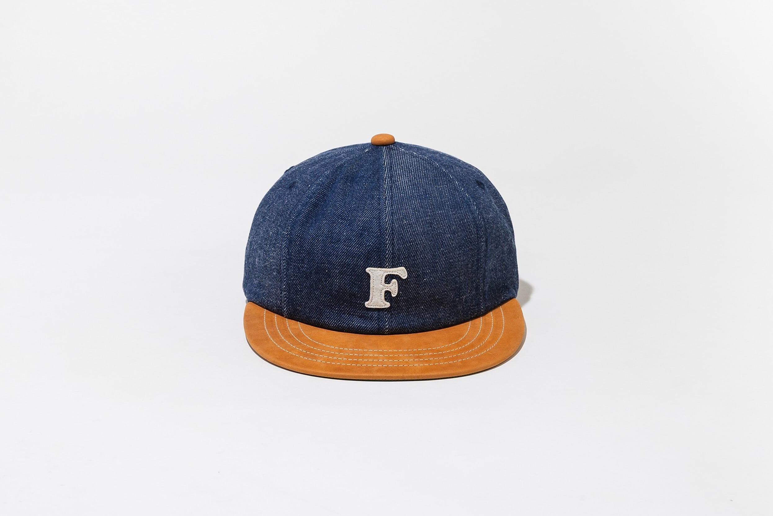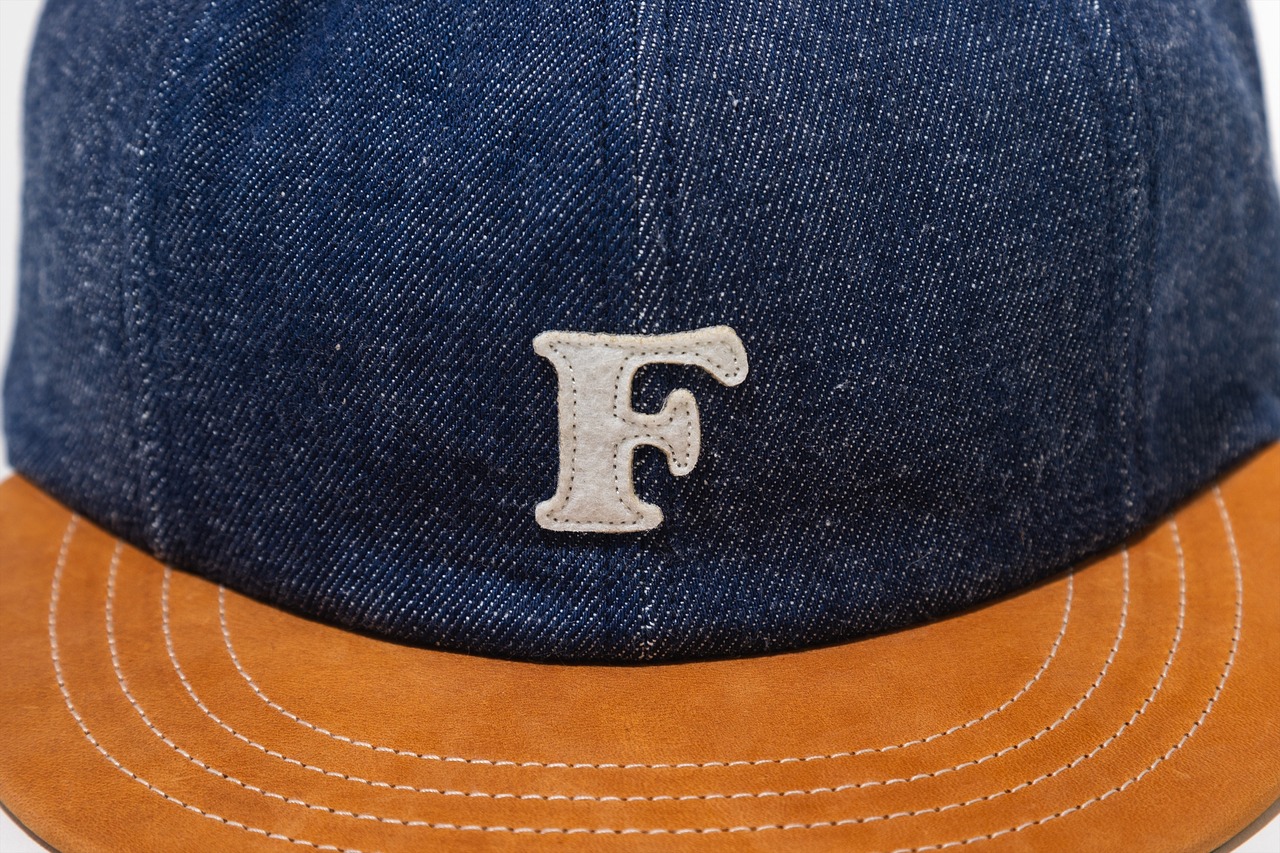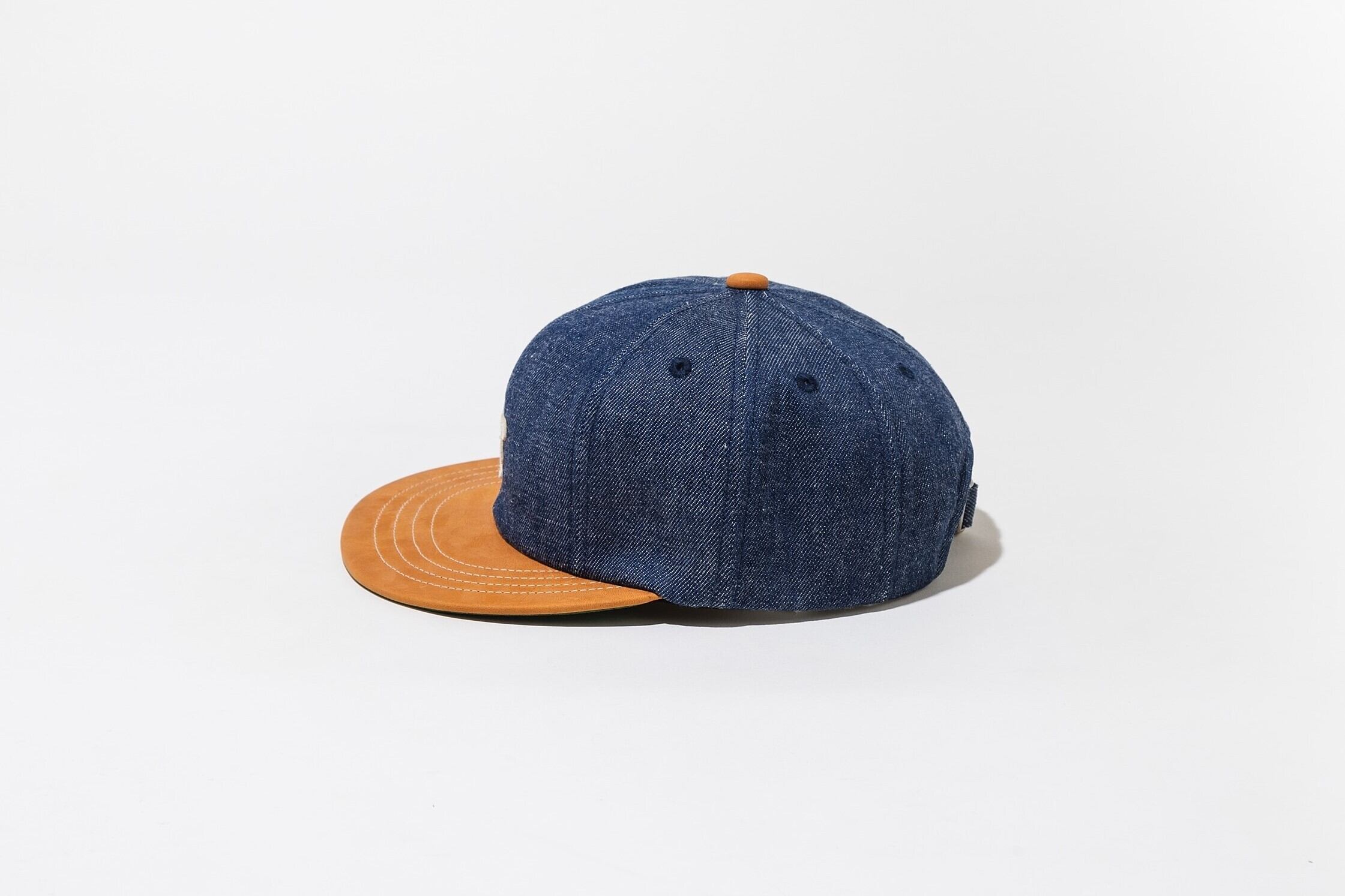 デニムとレザーの異素材を組み合わせた8パネルフラットバイザーキャップです。