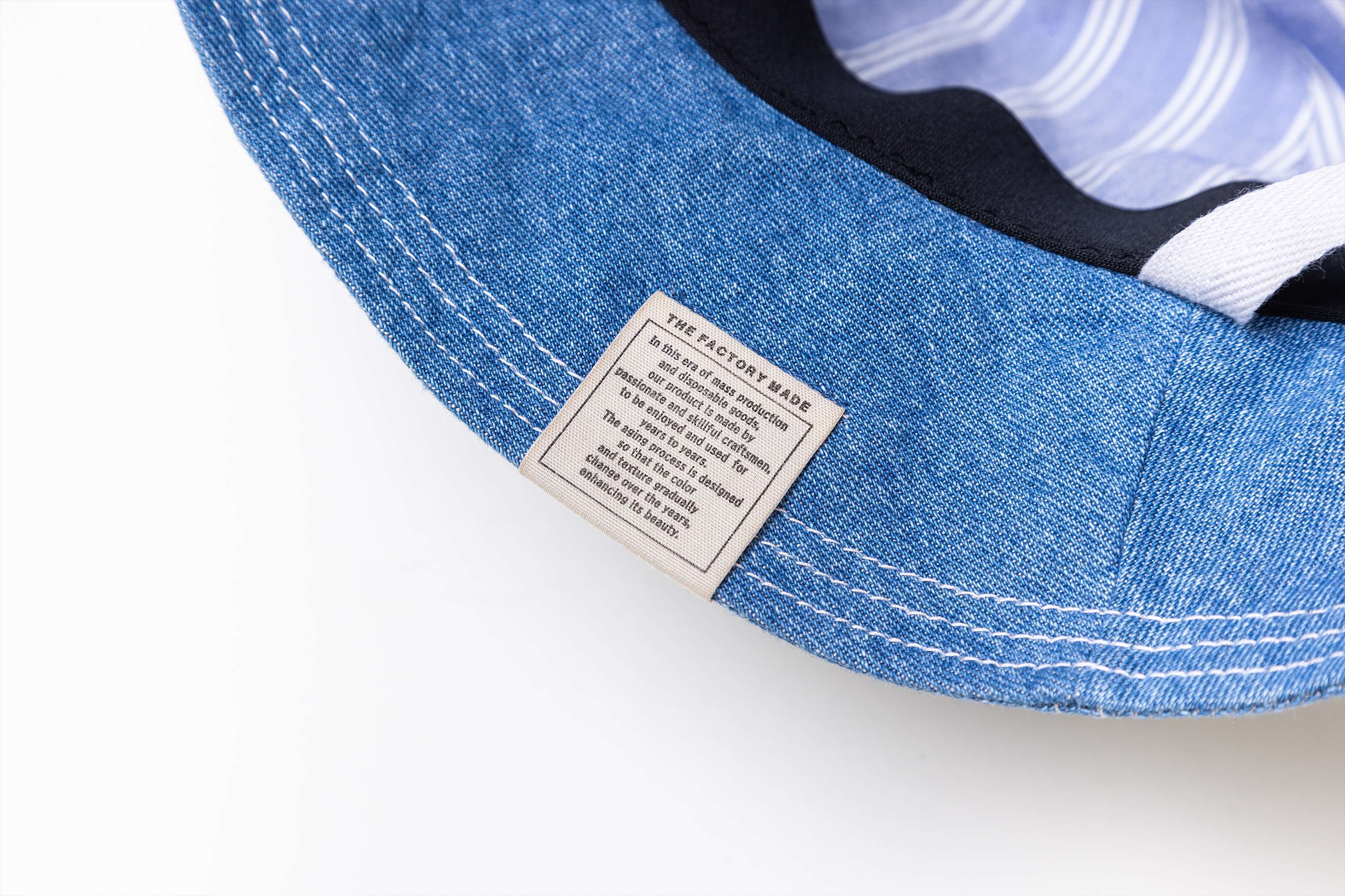 裏地にはクールマックスのストライプ生地、サイドのブランドネームにはコーヒー染めを施し、さらにあごヒモはシューレースをイメージしたチップ付きのヘリンボーンテープを使い、細部まで拘り抜いたモデルです。