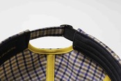 トラディショナルなチェック柄とクラシカルな生地の組み合わせでブリティッシュな雰囲気ながら、菊穴部分の刺繍と裏のテープをポップなカラーリングにし、遊び心を加えています。